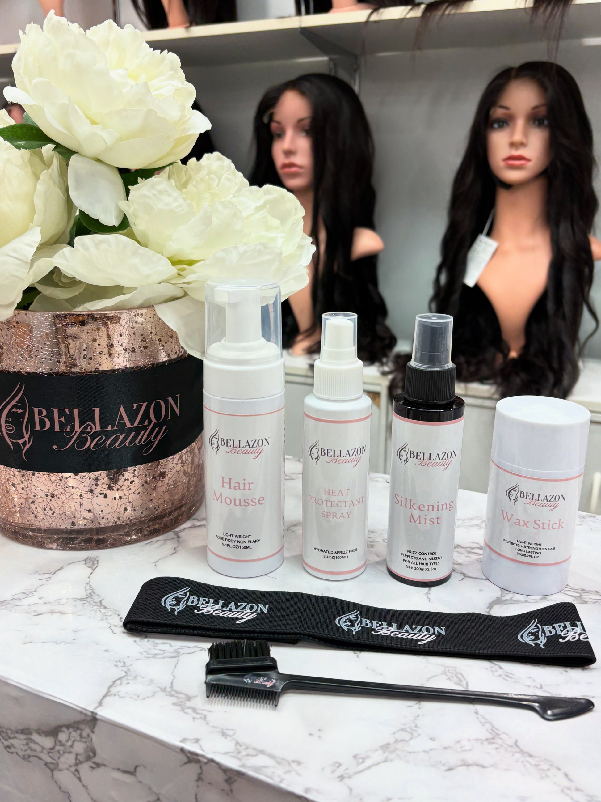 Wax stick, hair mousse, heat protectant spray, silk mist, elastic headband & edge control brush (value $48)
